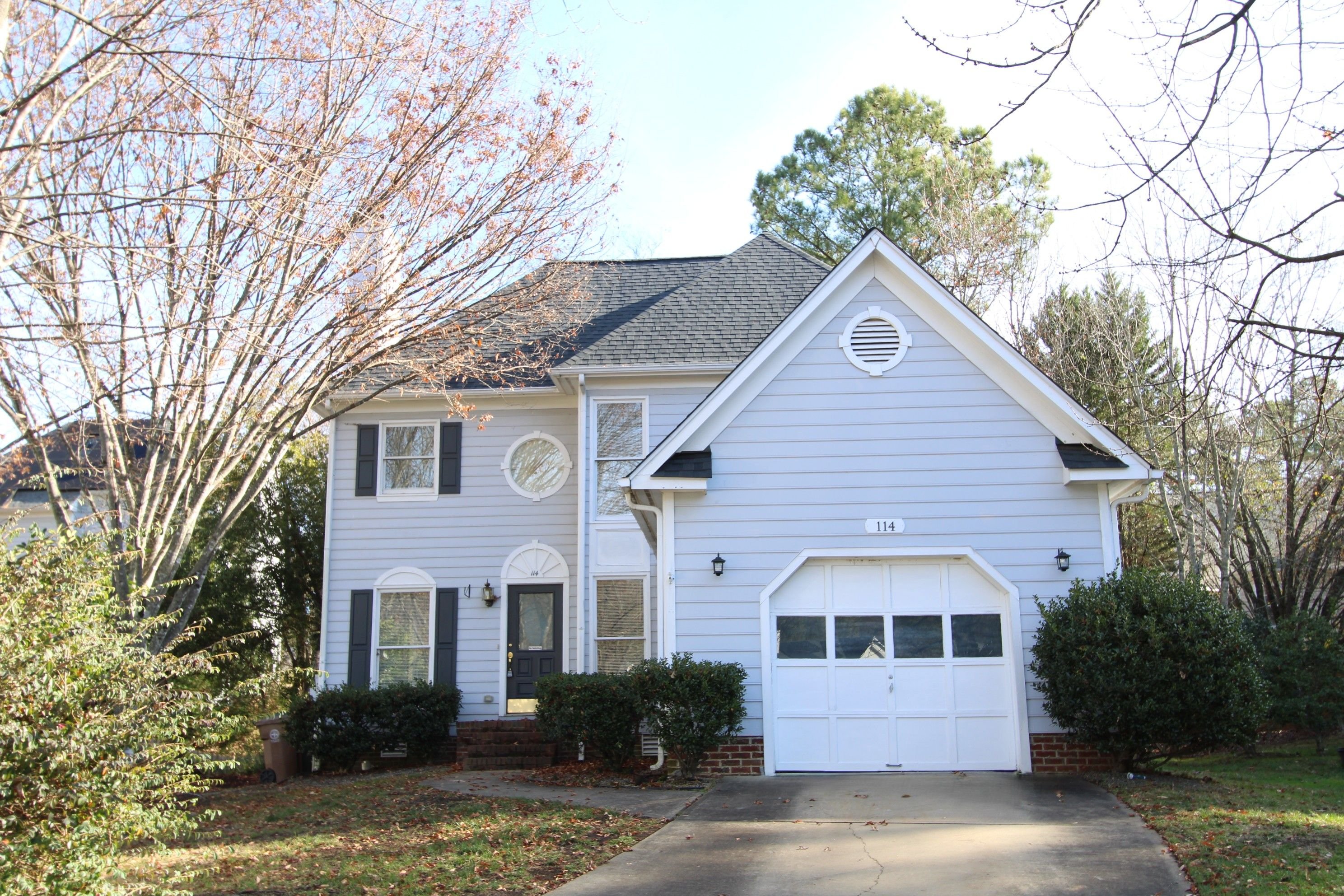 Available immediately, this beautifully maintained two-story home at 114 Covewood Court welcomes you with charming curb appeal, a classic front entry, and mature landscaping that enhances its peaceful cul-de-sac setting in the heart of Cary. Step inside to a light-filled entryway that leads into a spacious family room complete with a gas fireplace framed in marble, a ceiling fan, and generous windows that fill the room with natural light while providing a seamless connection to the kitchen and dining spaces. The bright, open kitchen features a large bay-window breakfast area overlooking the backyard, abundant cabinetry, expansive countertops, a center island, pantry, stainless steel appliances - including a gas range and French-door refrigerator and two picture windows above a double undermount sink. A formal dining room with sunlit windows offers a dedicated entertaining space or doubles as a home office, playroom, or flex area, and the first-floor powder room adds everyday convenience. Upstairs, the primary suite impresses with vaulted ceilings, a large walk-in closet, and an airy atmosphere that easily accommodates additional seating or workspace, all complemented by an en-suite bath with a garden tub, tiled shower, marble-topped double vanity sink with recessed soffit lighting just above, and a private water closet featuring a charming circular window. Bedrooms two and three are both equally spacious, each with double-door closets and picture windows. Bedroom 3 shares direct access to a well-appointed full hall bathroom with a marble topped double vanity and shower/tub combination. The one-car garage provides plentiful storage. Outside, the private backyard retreat offers mature trees, a generous deck, and a stone and gravel path creating a beautifully natural setting with minimal lawn maintenance, perfect for outdoor relaxation without the hassle of weekly yard work.